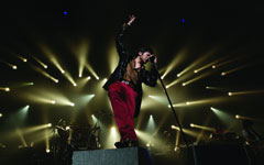 武田真治(Sax) 1990年にドラマ「なかよし」で俳優デビュー。92年フジテレビの深夜ドラマ「NIGHT HEAD」で注目を浴びブレイク。サックスプレイヤーとしてはDragon AshやHYDEなどのレコーディングに参加。最近ではフジテレビ「新堂本兄弟」の堂本ブラザーズバンドの一員としてもお馴染み。吉川晃司とはライブでは初共演となる。 |