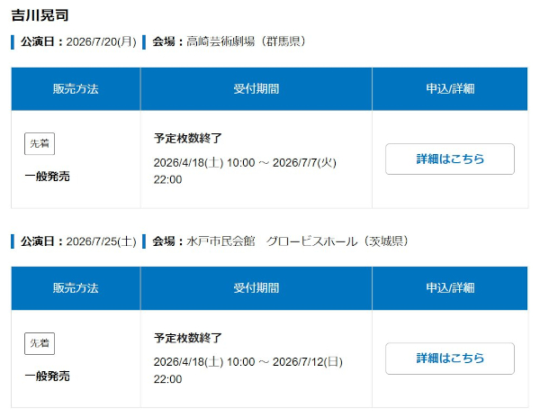 見ていて思ったのが、一般発売を行うことなく先行ですべて完売してしまった公演もいくつかあったので一般発売まで待とうという人は手遅れになることもしばしば。